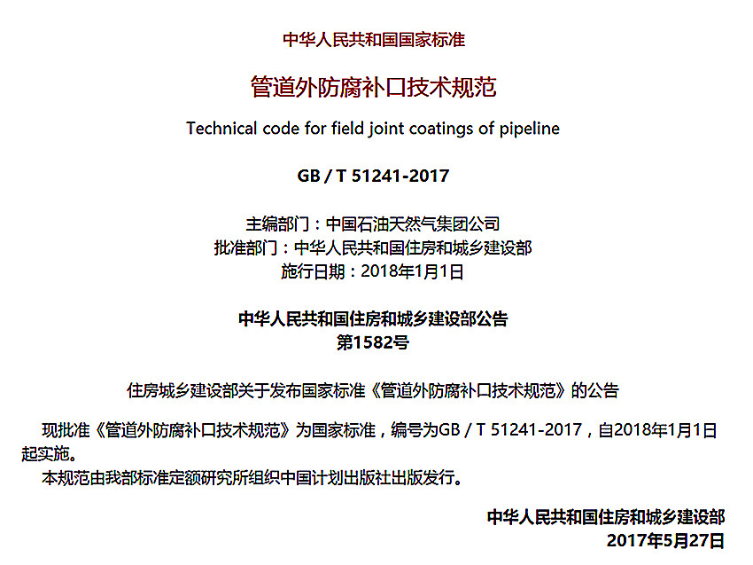 管道外防腐涂料補口標準GB/T 51241-2017介紹了:1補口涂層、2不扣防腐涂料、3補口施工、4補口質量檢驗。 防腐涂料補口防腐層可分為液體環氧涂料補口防腐層(2A)和液體聚氨酯補口防腐層(2B),防腐涂料補口防腐層適用溫度宜為—20℃~80℃。 防腐涂料補口防腐層等級分可為普通級和加強級,