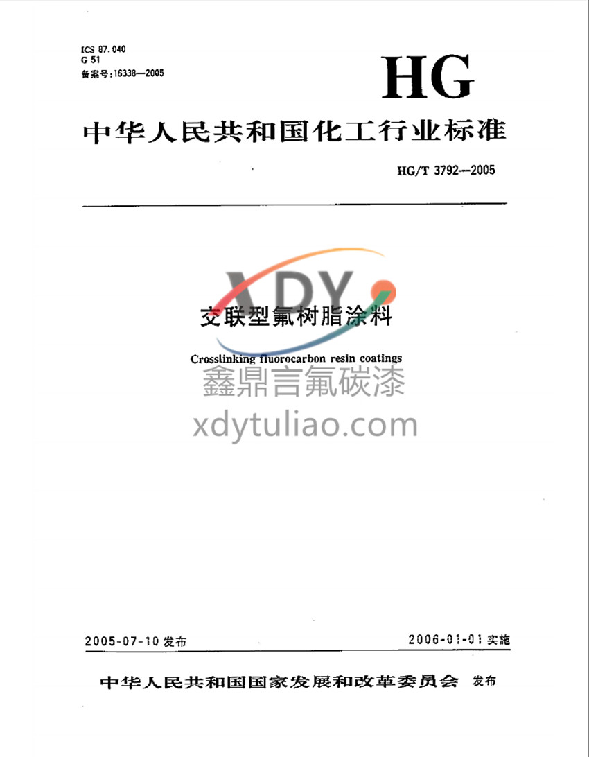 交聯型氟樹脂涂料化工行業標準HG/T 3792-2005:中華人民共和國化工行業標準 2005-07-10發布 2006-01-01實施 中華人民共和國國家發展和改革委員會發布 本標準適用于以含反應性官能團的氟樹脂為主要成膜物并加入顏填料(清漆不加)、溶劑、助劑等輔料作為主劑、以脂肪族多異氰酸酯樹脂為固化劑的雙組份常溫固化型建筑外墻用面漆和金屬表面用面漆。本標準還適用于以含反應性官能團的氟樹