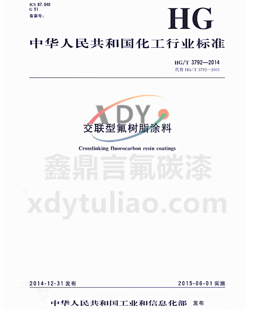 中華人民共和國化工行業標準HG/T3792-2014交聯型氟樹脂涂料替代HG/T3792-2005 本標準根據交聯型氟樹脂涂料的主要應用領域分為3種類:Ⅰ型為建筑外墻用氟樹脂涂料;Ⅱ型為橋梁、儲罐等混凝土設施表面用氟樹脂涂料;Ⅲ型為鋼結構等金屬表面用氟樹脂涂料。 常溫交聯型氟碳漆按化工行業標準HG/T3792-2014交聯型氟樹脂涂料執行,性能達到標準中的技術要求
