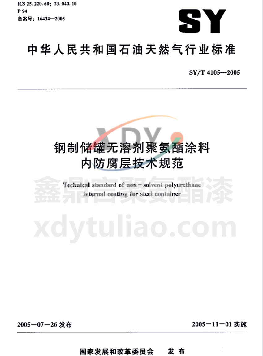 SY/T 4105-2005鋼制儲罐無溶劑聚氨酯涂料內防腐層技術規范 ICS 25.220.60;23.040.10 P 94 備案號:16434-2005 SY 中華人民共和國石油天然氣行業標準 SY/T 4105-2005 鋼制儲罐無溶劑聚氨酯涂料內防腐層技術規范Technical standard of non-solvent polyurethane internal coatings f