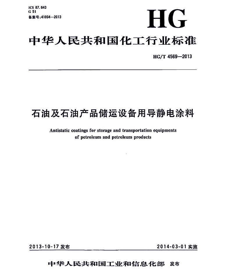 HG/T 4569-2013石油及石油產品儲運設備用導靜電涂料標準 ICS87.040 G51 備案號:41894-2013 HG 中華人民共和國化工行業標準 HG/T 4569-2013石油及石油產品儲運設備用導靜電涂料 Antisocial coatings for storage and transportation equipments of petroleum and petroleum